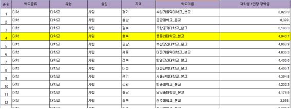 재학생1인당 장학금 494만원 전국 4위, 충북 1위