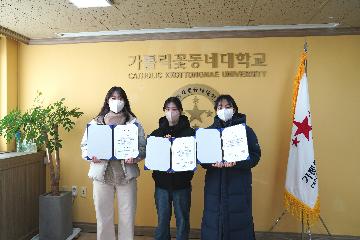 우리 대학 간호학과는 지난 20일 교내 3층 회의실에서 청주성모병원 장학금 수여식을 진행했다. 장학금 수여자는 간호학과 20학번 박O희, 안O래, 오O주 총 3명의 학생이 최종 선정됐다. 세 학생은 투철한 봉사정신과 타의 모범이 되는 우수한 인재로서 우리 대학의 대표 장학생으로 선발됐다.