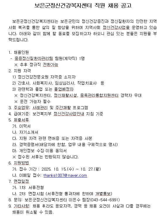 보은군정신건강복지센터 직원 채용 공고