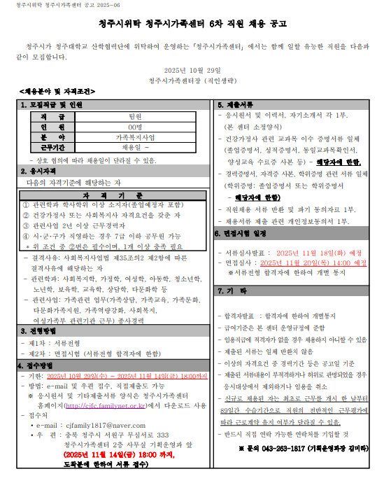 청주시위탁 청주시가족센터 6차 직원 채용 공고