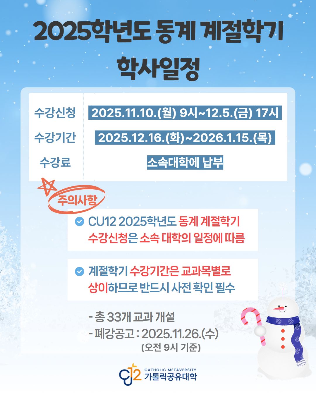 [가톨릭공유대학(CU12)] 2025학년도 동계 계절학기 학사일정 및 개설교과목 안내