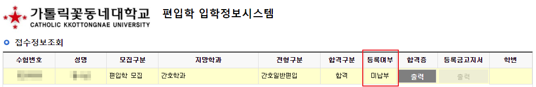우리 대학의 편입학 모집 등록은 2026.1.21.(수) 15시 ~ 1.23.(금) 16시까지 '등록금'을 납부하여야 등록 절차가 마무리됩니다.