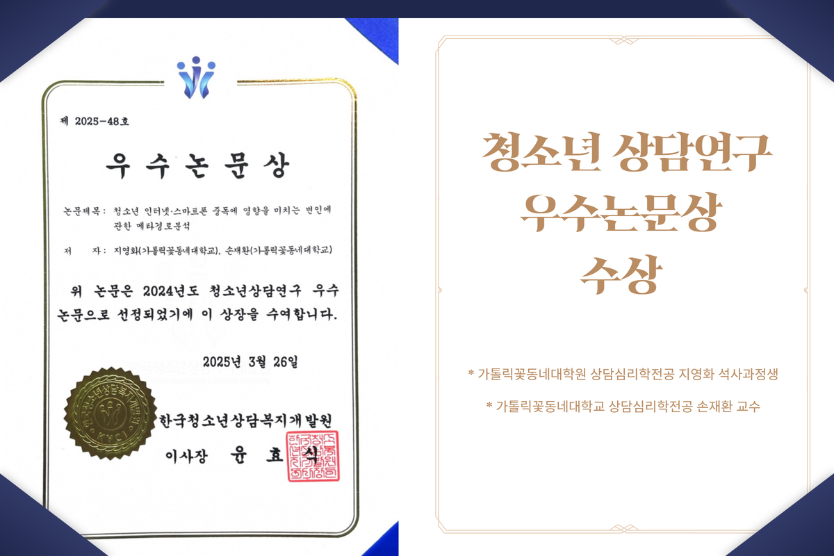가톨릭꽃동네대학교 대학원 상담심리학전공 지영화 석사과정생과 손재환 교수가 발표한 논문이 2024년도 '청소년상담연구' 우수 논문으로 선정됐다.