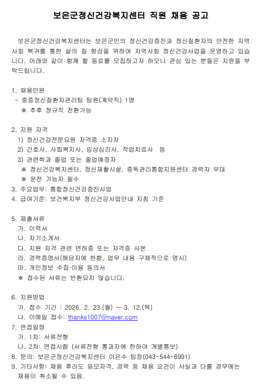 보은군정신건강복지센터 직원 채용 공고
