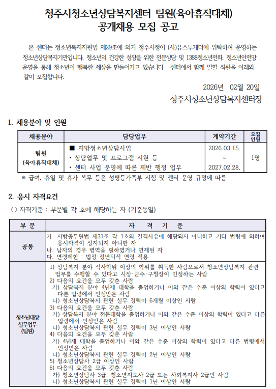 청주시청소년상담복지센터 팀원 공개채용 모집 공고