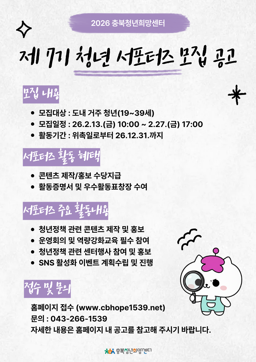 2026년 충북청년희망센터 제7기 청년 서포터즈 모집 공고