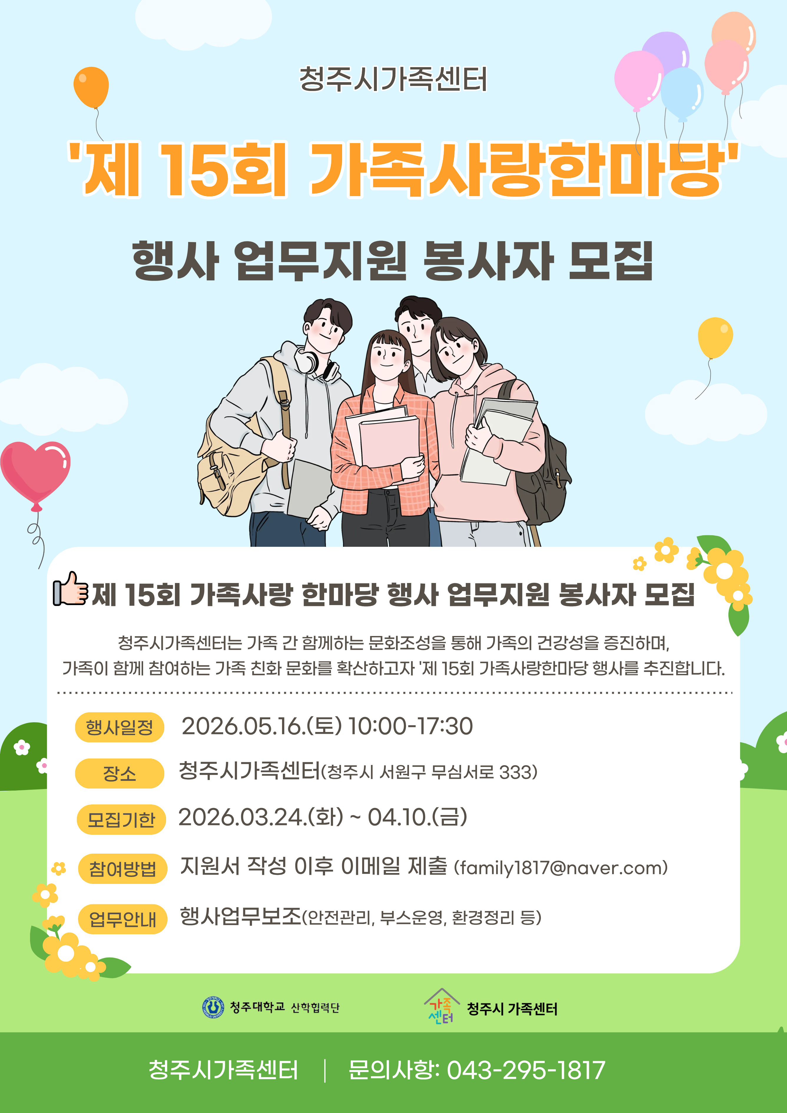 (청주시가족센터) 2026년 제 15회 가족사랑한마당 자원봉사 모집 재안내