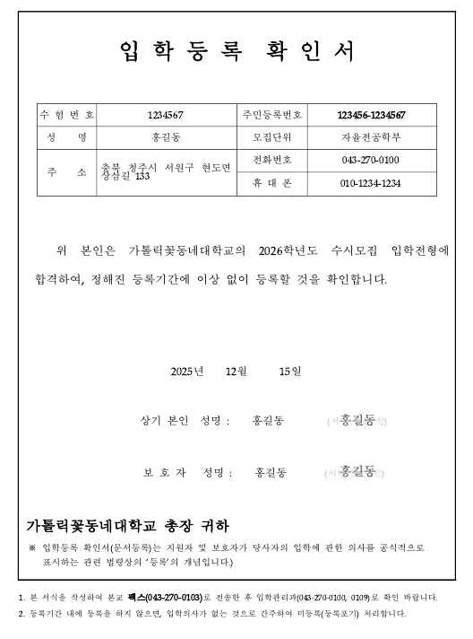 ※ 입학등록확인서 예시